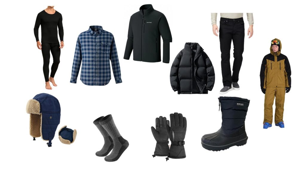 ウールの長袖下着上下 化繊スポーツシャツ フリース ダウンジャケット あったかジーンズ その上からスキーウエア上下